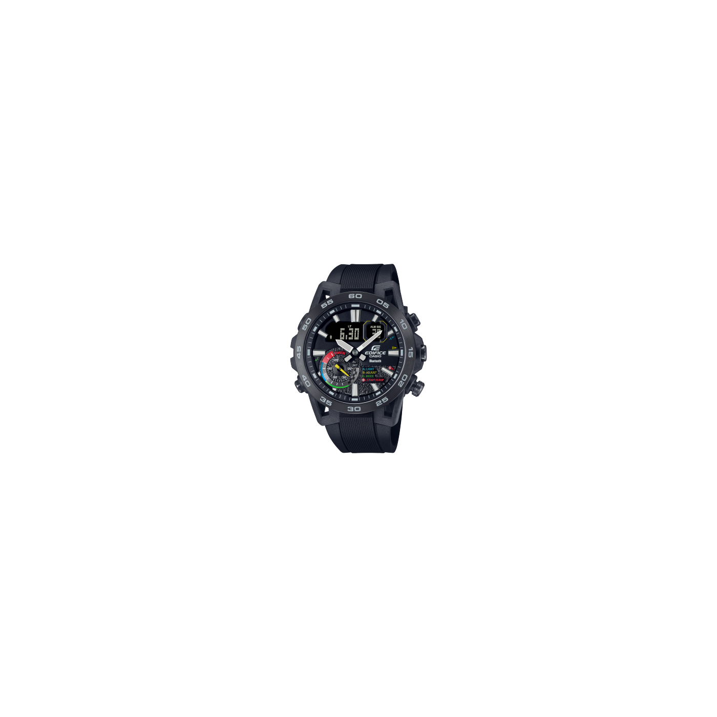 Ti presentiamo EDIFICE SOSPENSIONE ECB-40, dove le forme tipiche degli sport motoristici si fondono a funzionalità e raffinatezza, con un design che richiama il braccio delle sospensioni in resina rinforzata con fibra di carbonio e funzioni di connessione allo smartphone. L'esclusivo design della cassa si ispira alle sospensioni delle auto di Formula 1 con le alette configurate secondo una disposizione a quattro bracci, due sopra e due sotto. La resina rinforzata con fibra di carbonio rende la cassa leggera ma allo stesso tempo resistente. Grazie alla funzionalità Bluetooth, questo speciale orologio si connette automaticamente quando si trova nel raggio d'azione dello smartphone a cui è associato. Apri l'app per accedere a funzioni importantissime per i team delle scuderie automobilistiche: indicazione accurata dell'ora con regolazione automatica fino all'ultimo secondo, gestione semplice dell'ora internazionale e trasferimento allo smartphone dei dati misurati dal cronometro fino al millisecondo per un massimo di 200 giri. Il Super Illuminator (doppia luce LED ad alta luminosità) illumina il display analogico-digitale garantendo una leggibilità anche al buio.