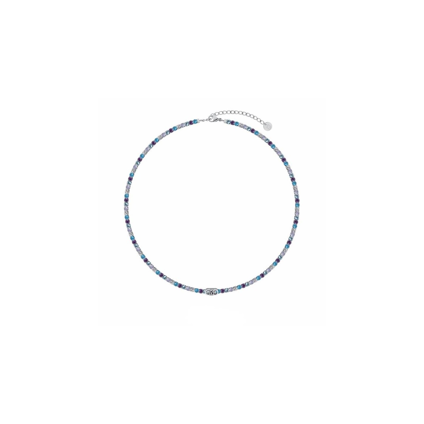 Collana Da Donna Di Liu Jo. Gioiello Realizzato In Acciaio, modello tennis con zirconi dalle varie sfumature di blu e glicine e con targhetta logata al centro.