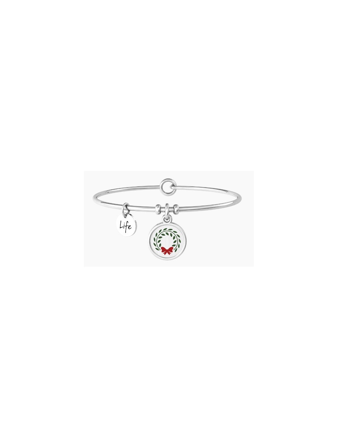 Bangle in acciaio con ciondolo tondo satinato, bordo lucido, smalto, cristallo bianco e scritta "Laurea".