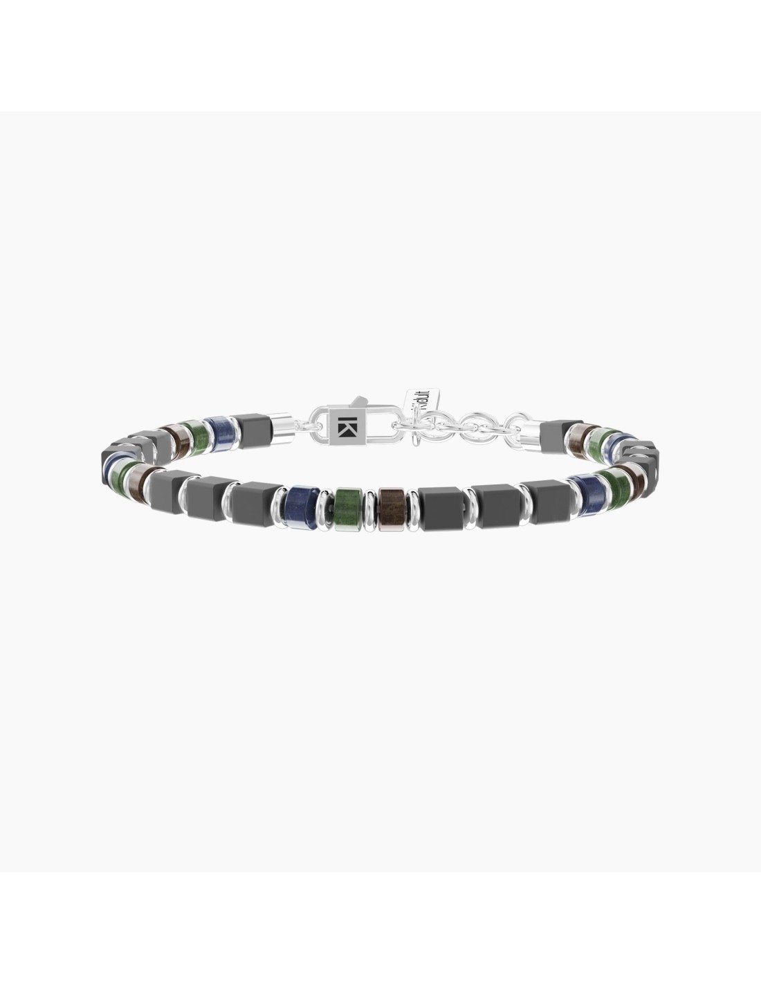 Bracciale uomo regolabile in acciaio con sodalite blu, giada, occhio di tigre ed ematite taglio quadrato.