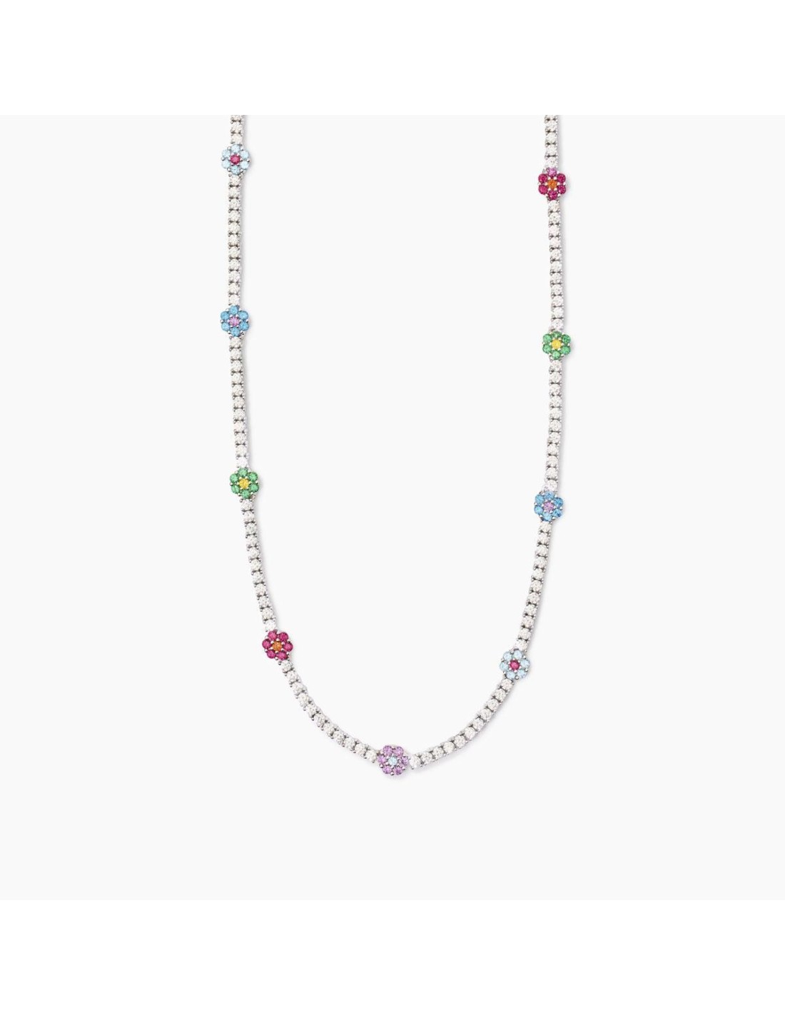 Girocollo tennis regolabile da donna in argento rodiato con elementi a forma di fiore con zirconi e bianchi.