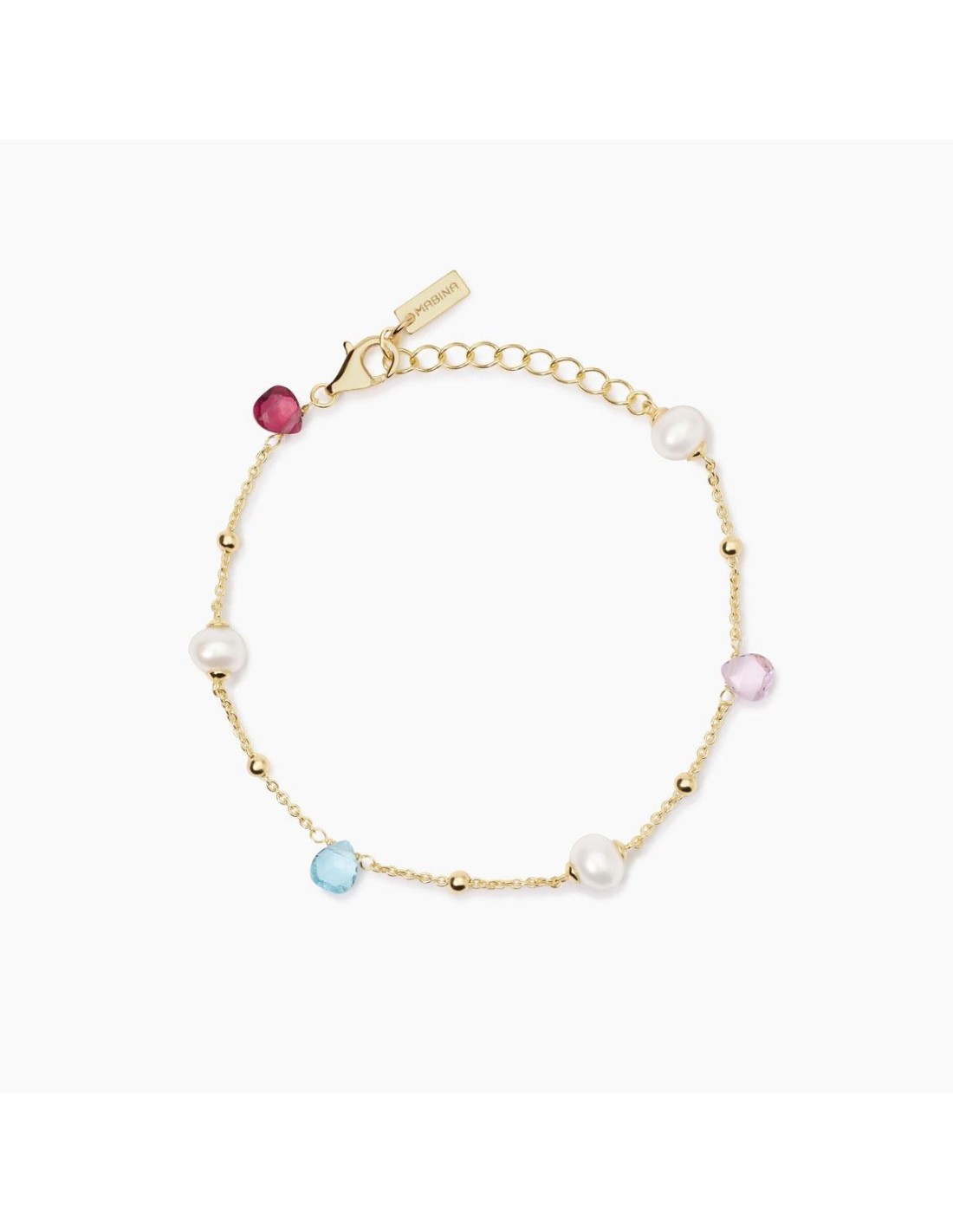Bracciale regolabile da donna in argento placcato oro giallo con catena forzatina, elementi in glass taglio goccia e perle coltivate.