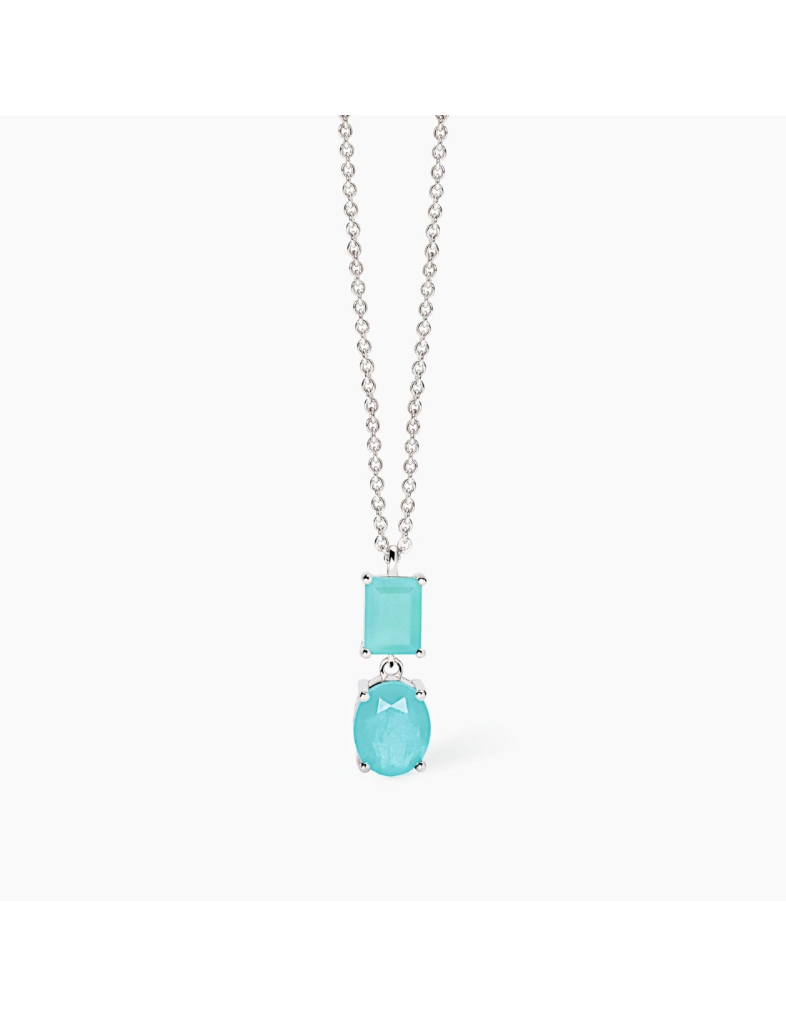 Girocollo regolabile da donna in argento rodiato con catena rolò, pendente con glass verde taglio baguette ed elemento in fusion stone in glass azzurro e cristallo di rocca taglio ovale.
