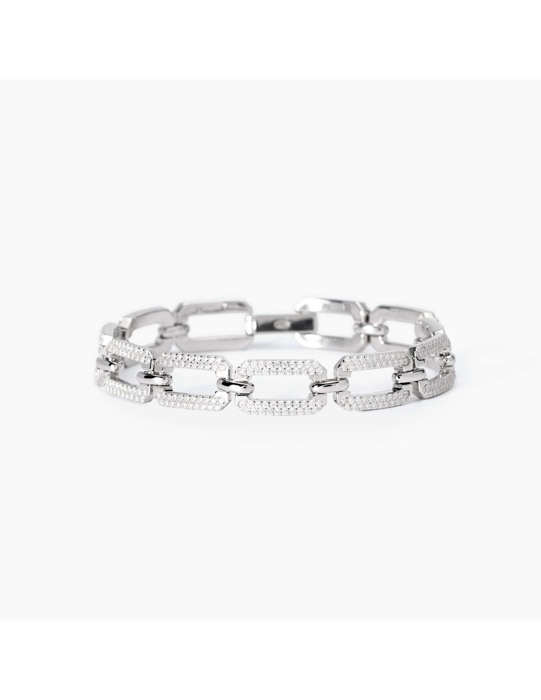 Bracciale da donna in argento rodiato con maglie ottagonali e zirconi.