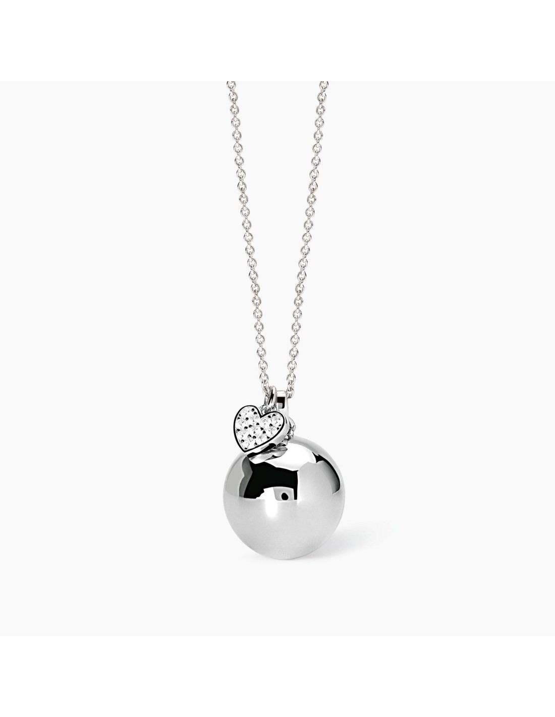 Collana da donna in argento rodiato con catena rolò, ciondolo Chiama Angeli e ciondolo a forma di cuore con zirconi.