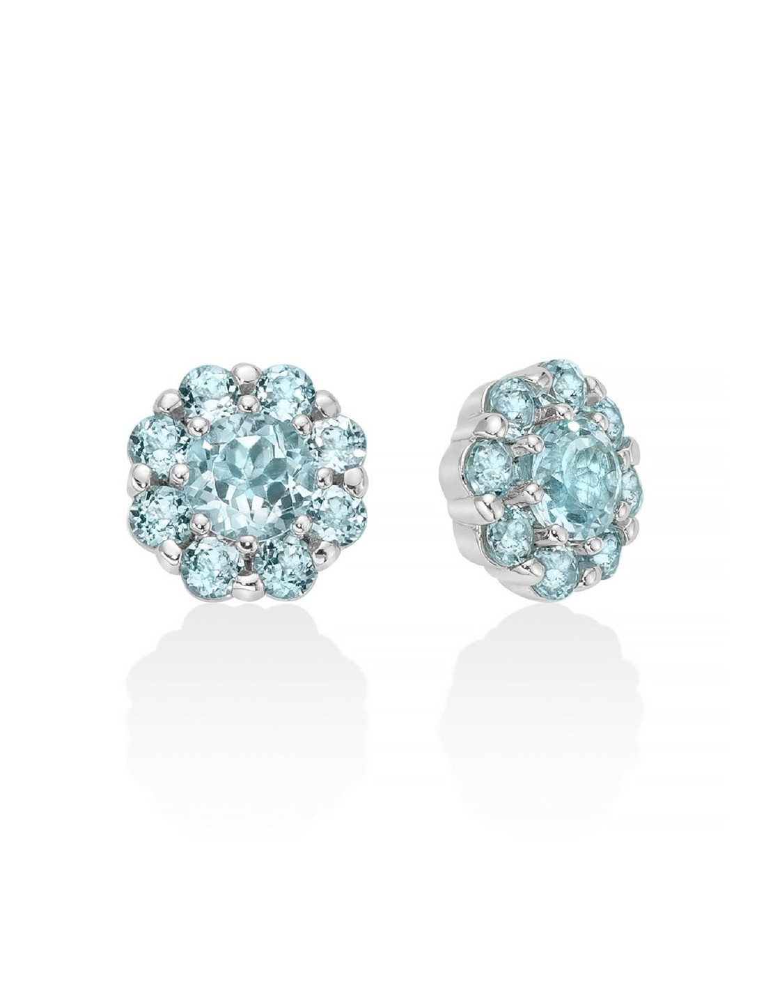 Orecchini a lobo della collezione Miluna Gemma del Cielo da donna. Colore: argento e azzurro. Gli orecchini sono in argento 925 rodiato con topazi azzurri naturali taglio brillante 6 mm posizionati al centro e da 8 topazi azzurri naturali taglio brillante su ogni orecchino. La caratura totale è di 22,4 ct. Le pietre sono posizionate in modo da formare un fiore. Chiusura a perno.