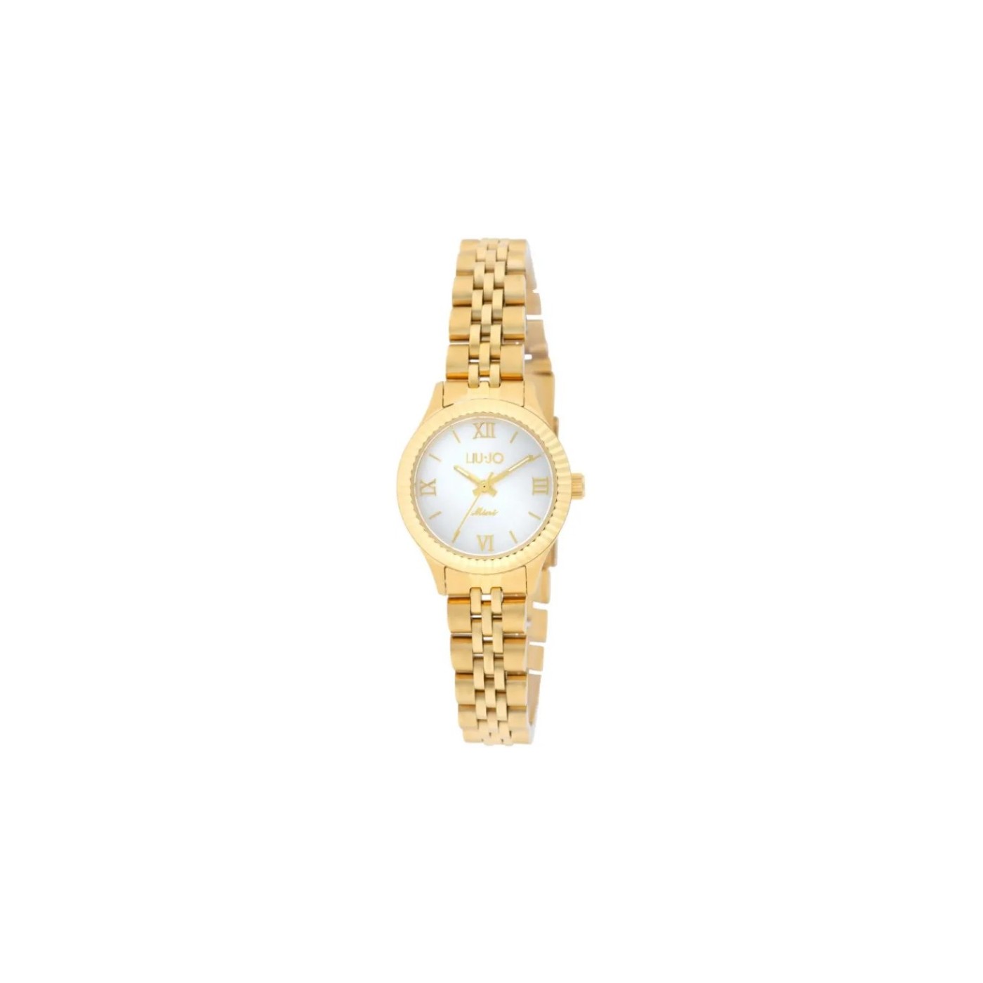 Cassa in acciaio color oro da 26 mm con lunetta zigrinata.