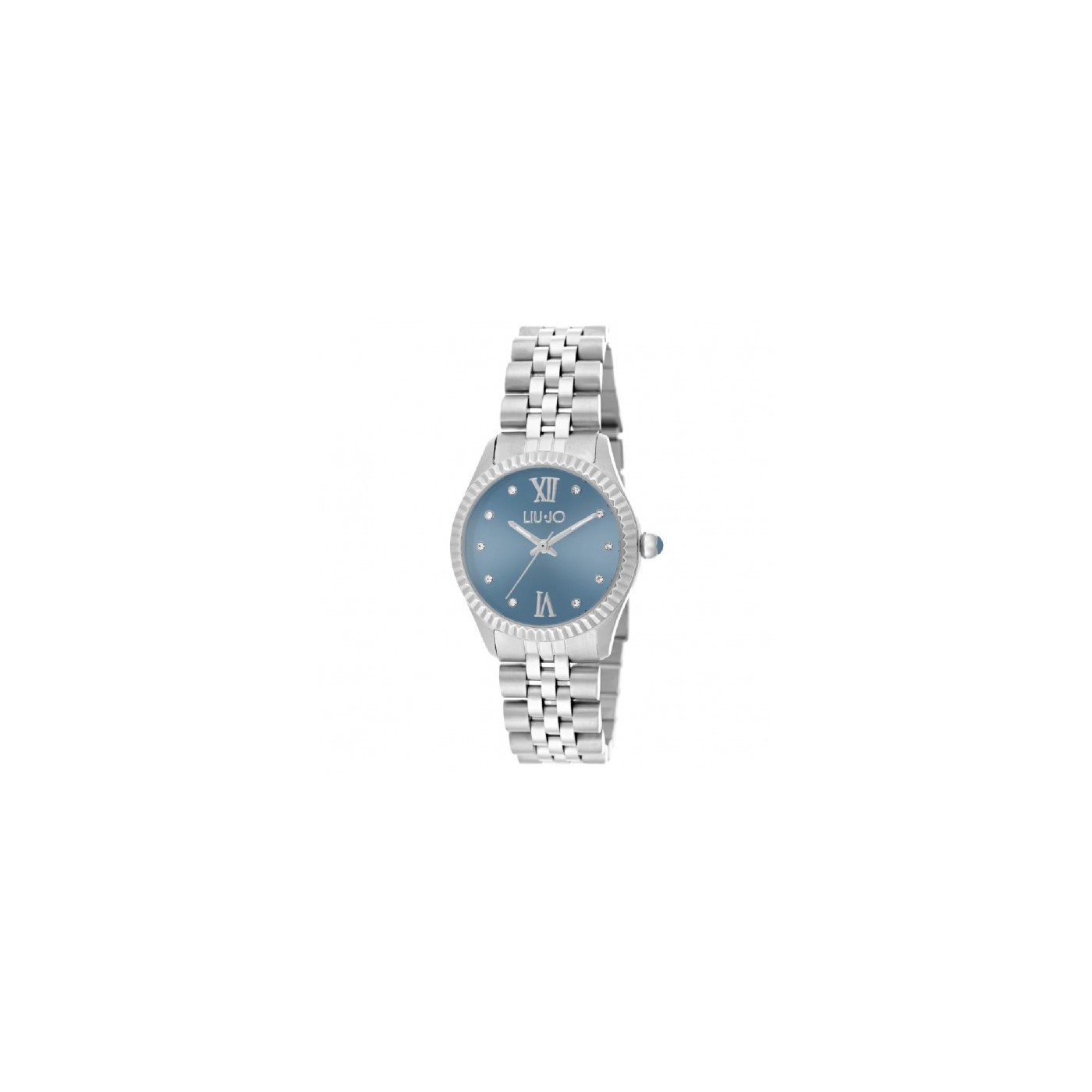 Quadrante analogico blu con cristalli bianchi agli indici, numeri romani a ore 21 e 6 e logo nella parte alta.