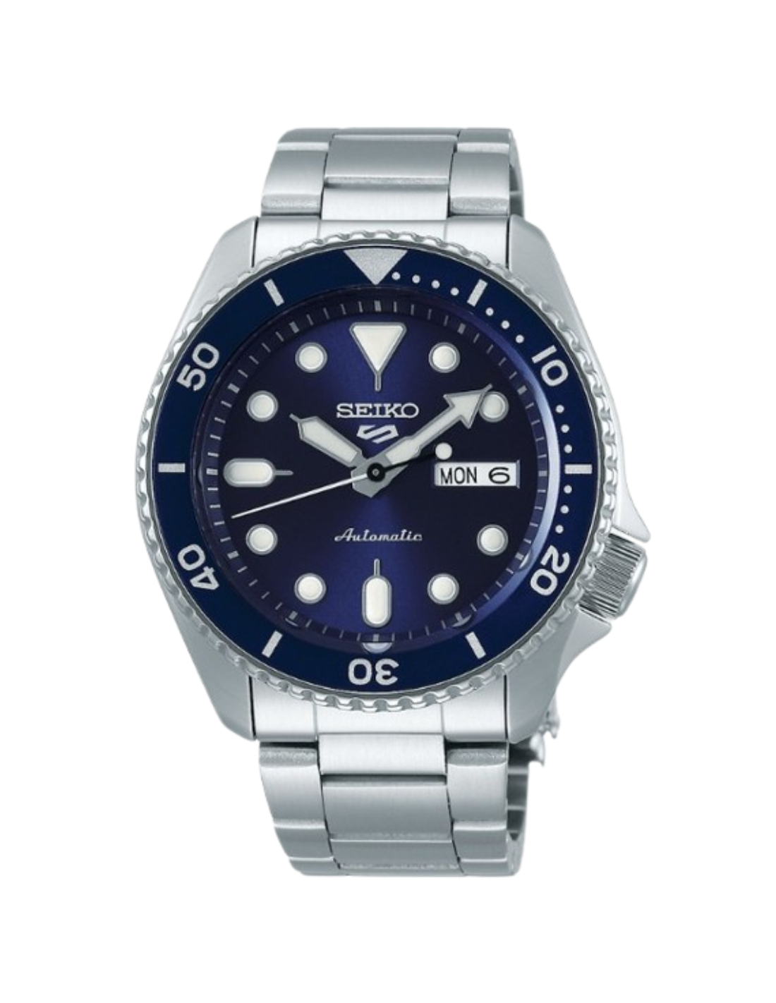 Esprimi il tuo stile sportivo con questo orologio automatico Seiko 5 Sports della linea Sports. Il quadrante blu come la lunetta comprende l'indicazione del giorno e della data, a ore 3, nonché il logo Seiko 5 Sports, a ore 12. Interamente in acciaio inossidabile, questo modello è impermeabile fino a 100 metri ed è è animato da un movimento automatico, che potrai ammirare attraverso il fondello a vite trasparente.