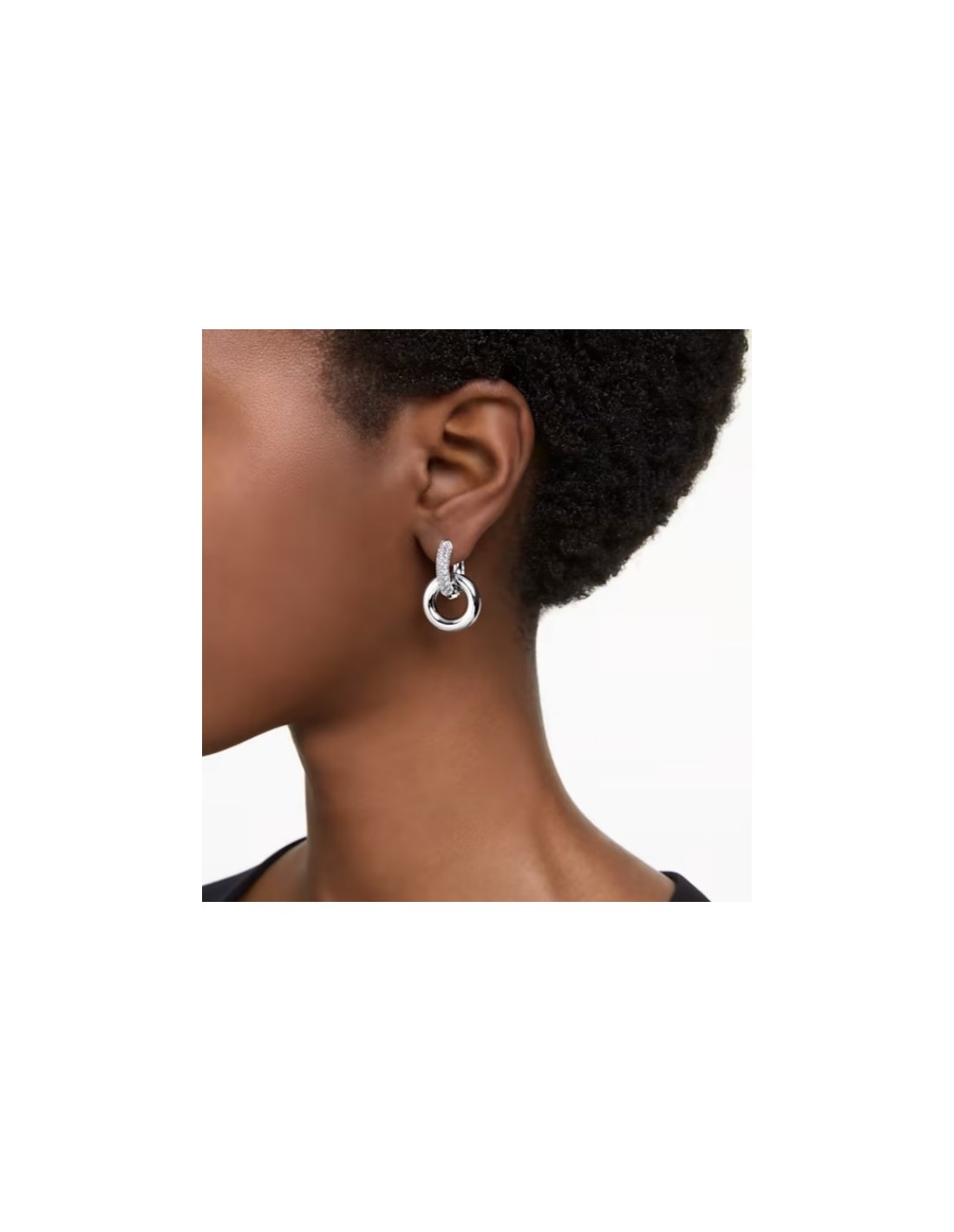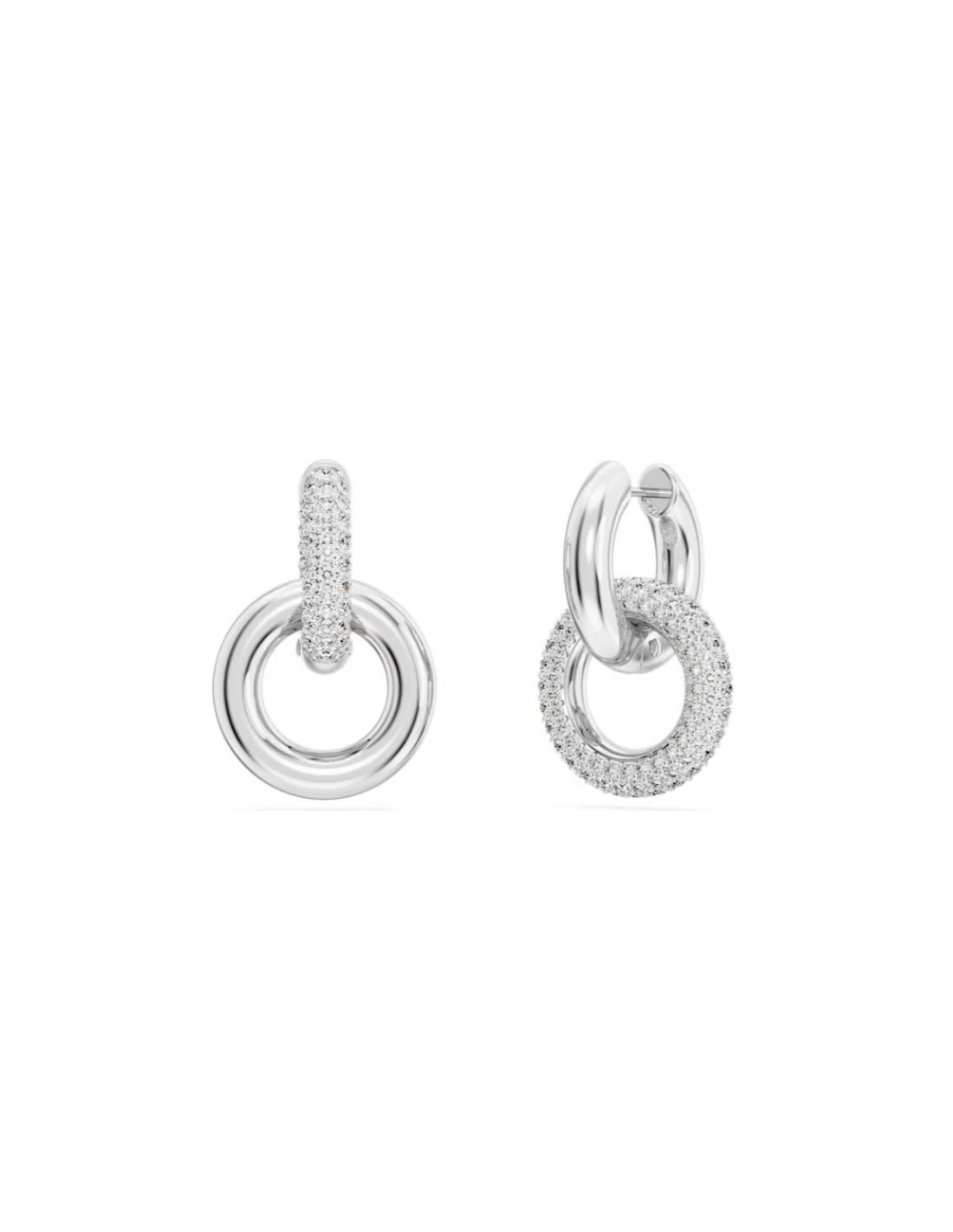 Questi orecchini a cerchio intrecciati della famiglia Dextera presentano due anelli tubolari placcati rodio, di cui uno impreziosito da pavé all-over. Per un ulteriore tocco asimmetrico, gli anelli sono disposti in modo diverso su ciascun gioiello. Inoltre, è anche possibile rimuovere il secondo cerchio per uno stile a cerchio singolo che offre una maggiore versatilità.