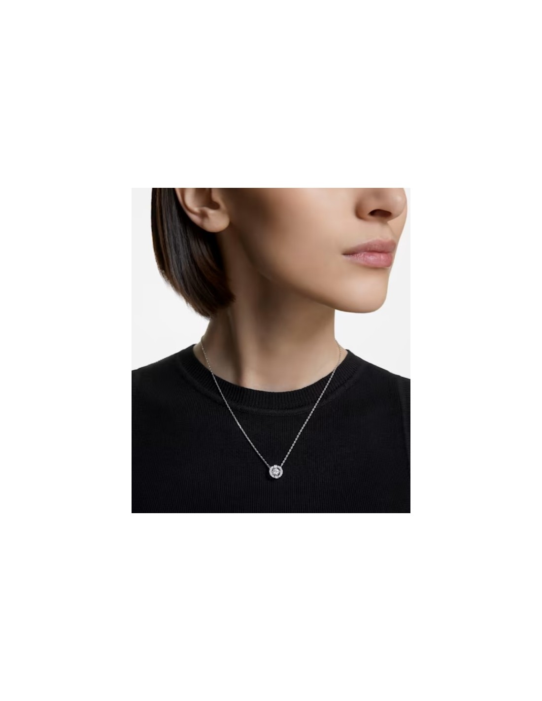 La collana rodiata interpreta lidea del cristallo danzante, qui proposto in un taglio tondo sospeso allinterno di una cornice metallica 3D impreziosita da pavé di cristallo. Unaggiunta irresistibile al vostro portagioie, ideale per sottolineare le vostre mise da giorno con una brillantezza giocosa.